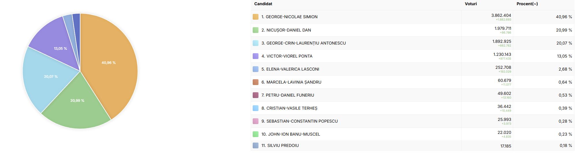 Alegerile prezidențiale din România, desfășurate pe 4 mai 2025, au oferit un rezultat surprinzător: George Simion, liderul partidului AUR, a obținut 40,96% din voturi, clasându-se pe primul loc. Pe locul al doilea s-a situat Nicușor Dan, primarul Bucureștiului și candidat independent susținut de o coaliție largă de partide de centru-dreapta, cu 20.99% din voturi. Crin Antonescu, candidatul Alianței România Înainte (formată din PSD, PNL și UDMR), a încheiat pe locul al treilea cu 20,09%