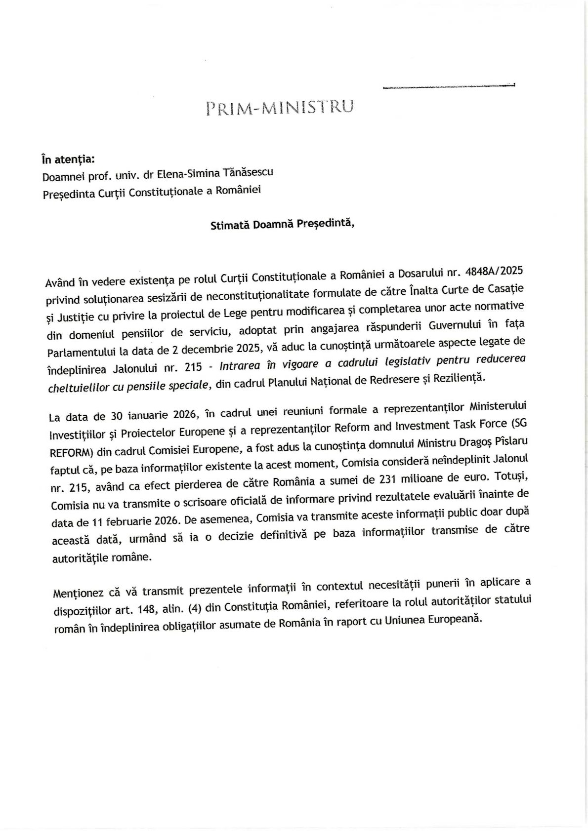 În documentul oficial, premierul avertizează că, potrivit informațiilor primite de la Comisia Europeană, jalonul 215 din PNRR – cel care vizează reforma pensiilor magistraților – este considerat, la acest moment, neîndeplinit. Consecința directă: pierderea sumei de 231 de milioane de euro. Ministrul Investițiilor și Fondurilor Europene a fost informat încă din 30 ianuarie că evaluarea preliminară a Comisiei este negativă, însă Bruxelles-ul a decis să mai aștepte verdictul Curții Constituționale înainte de a face publică poziția finală.
